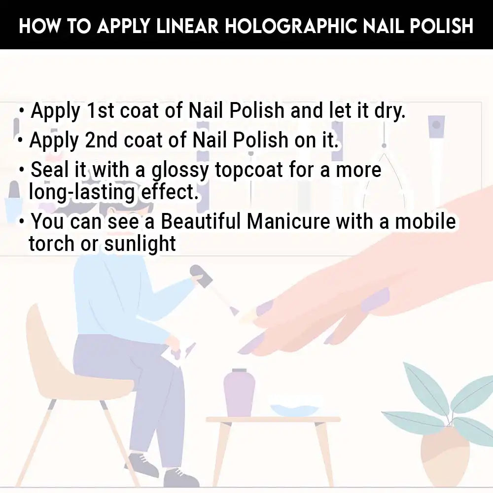 Apply the first coat of linear holographic nail polish. Ensure you cover the entire nail evenly. Let it dry completely before applying the next coat.