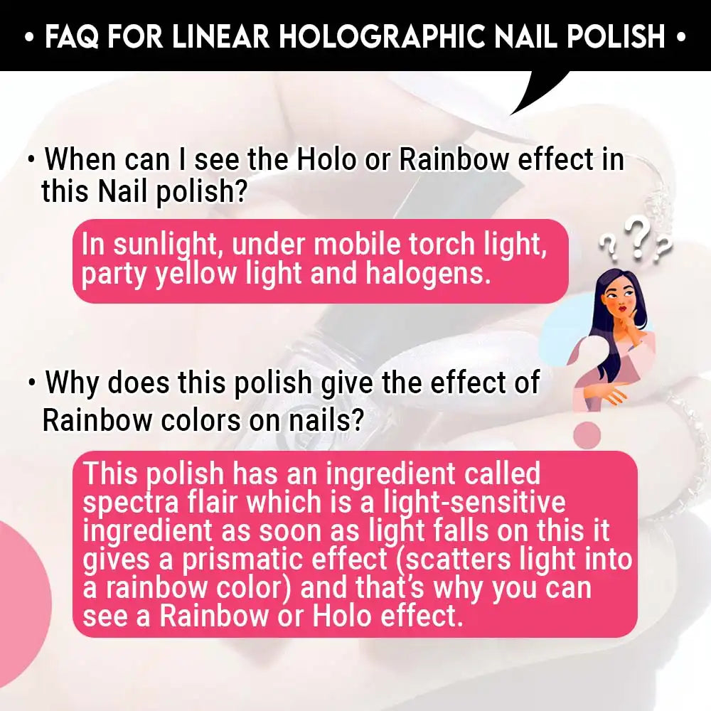 Once your nails are fully dry, enjoy the stunning rainbow effect of the linear holographic polish. Use a mobile torch or sunlight to see the full spectrum of colors in your beautiful manicure.