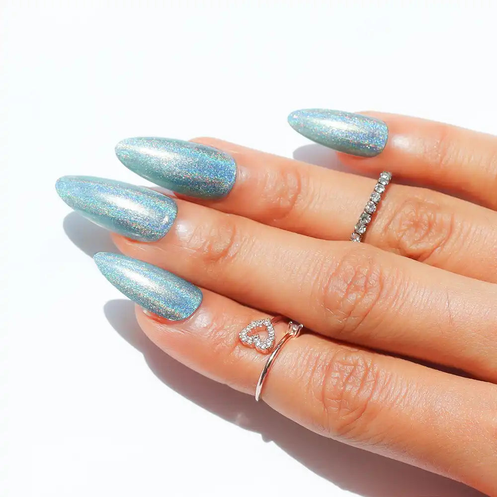 Gleaming aura is a silver shade with graceful holographic sparkle effect. These holo nail polish create a stunning multi-dimensional effect on your nails, reflecting different colours and giving them a breath-taking rainbow effect that resembles the prismatic beauty of a hologram.