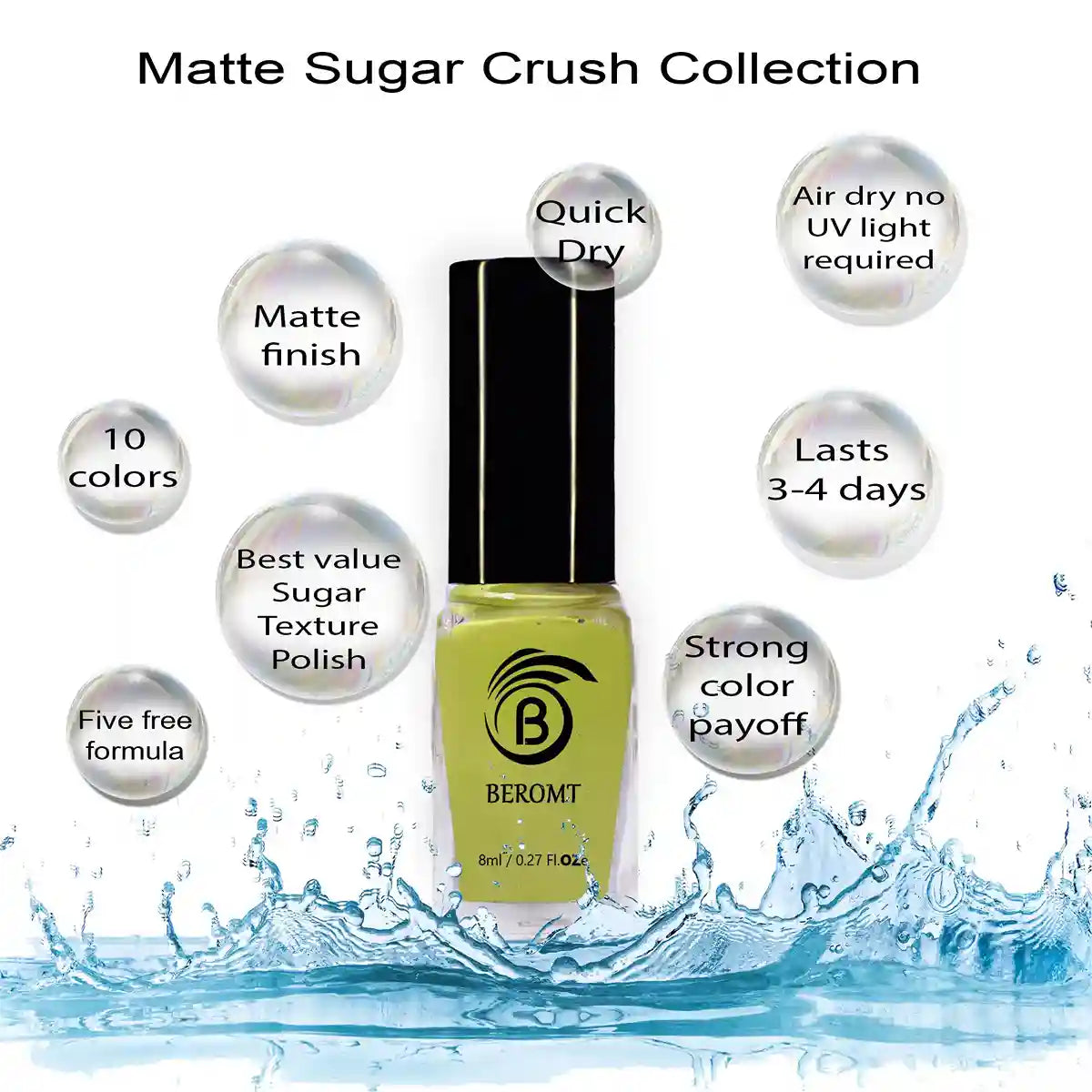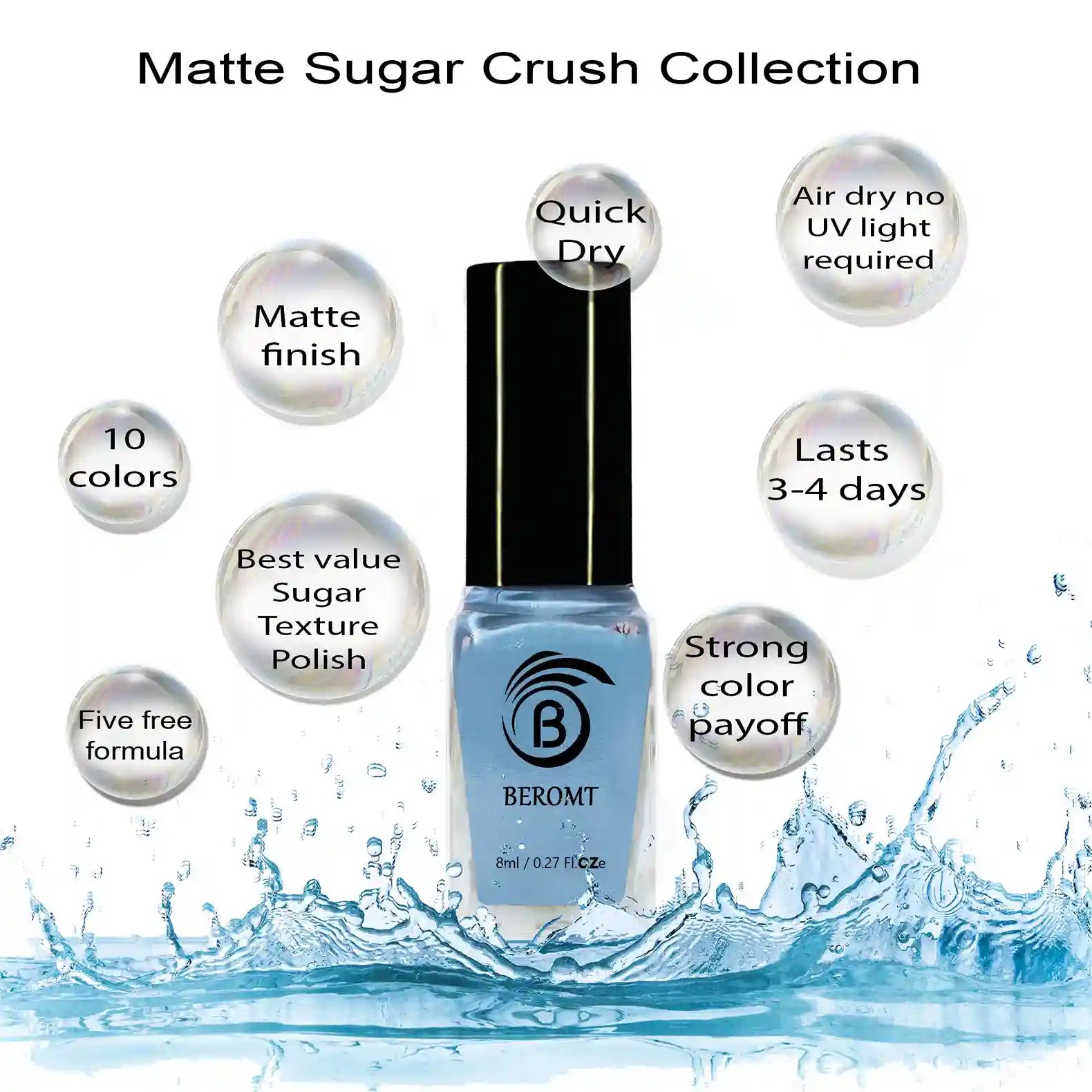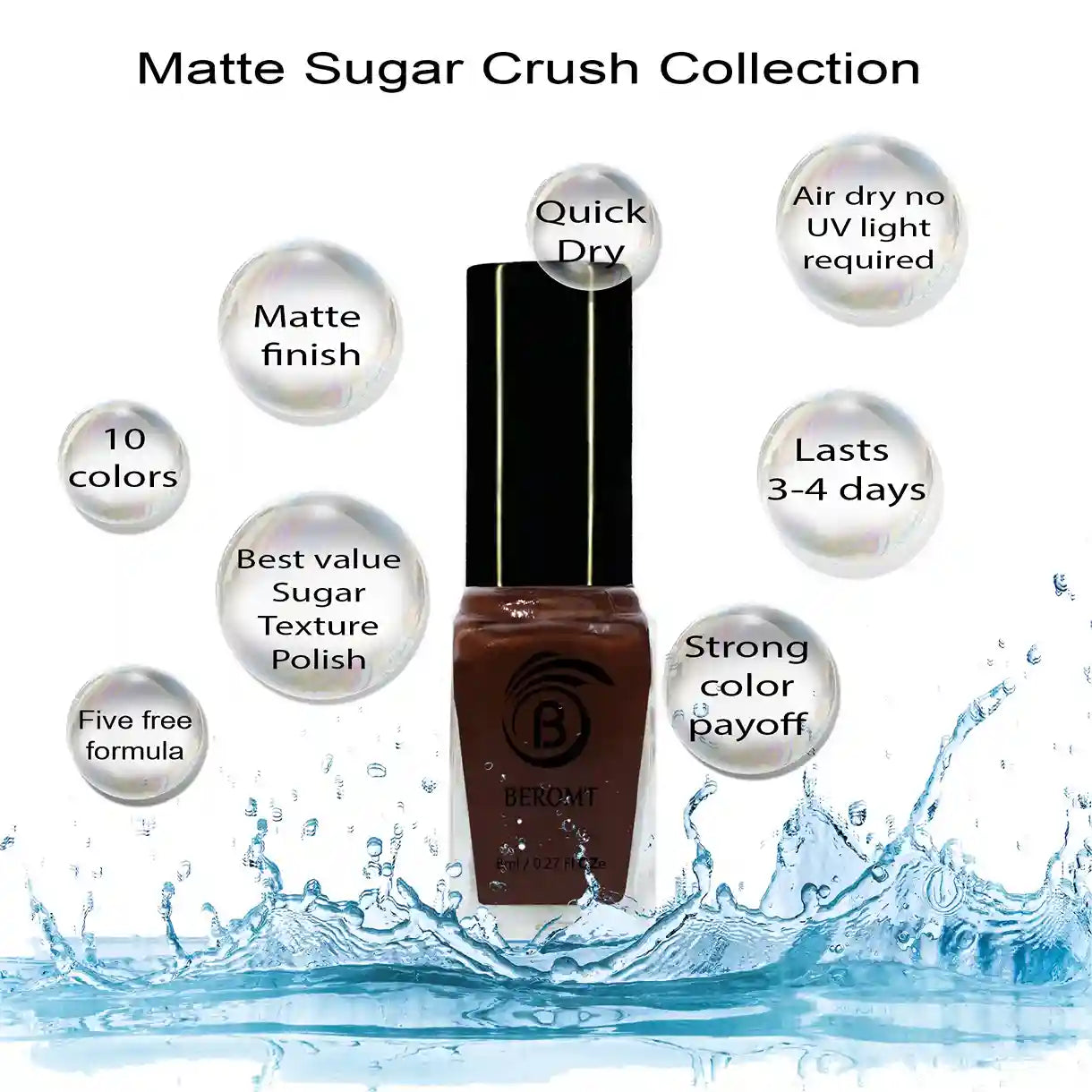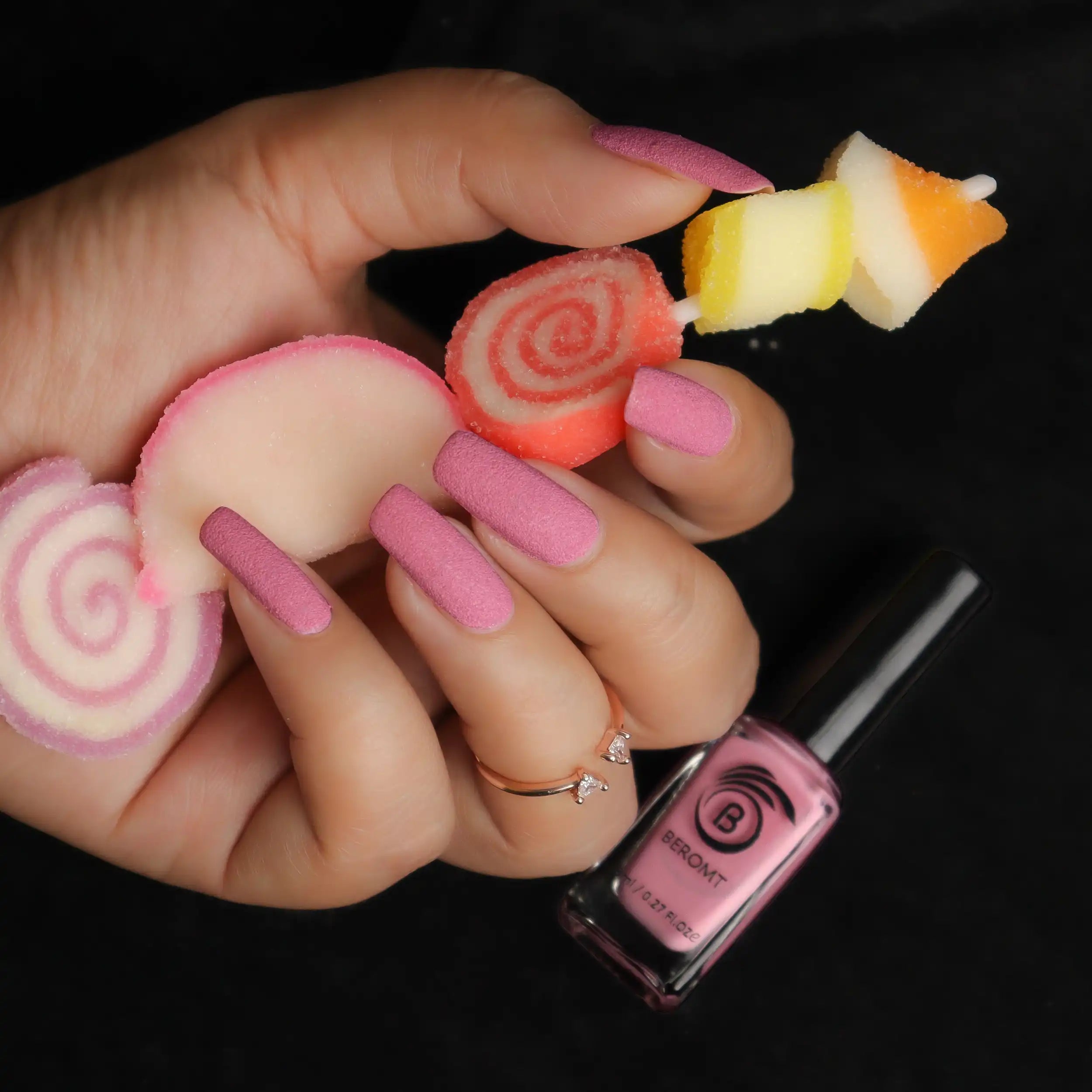 Candy for your nails! This special effect nail polish includes rich, sweet colors that dry to a surprising matte finish with a sugary 3D effect. Thick consistency that feels light on nails with a semi matte finish. Now that’s not very common. Beromt Matte Sugar Collection is best used as solid nail polish and for fun nail arts.