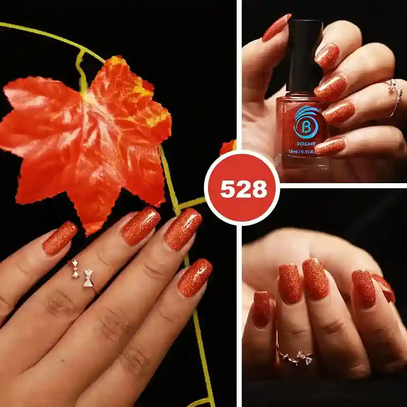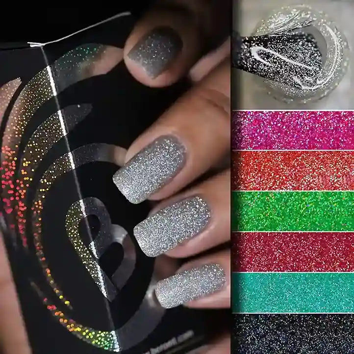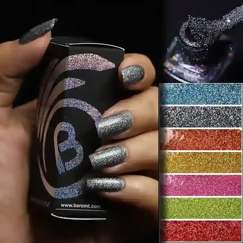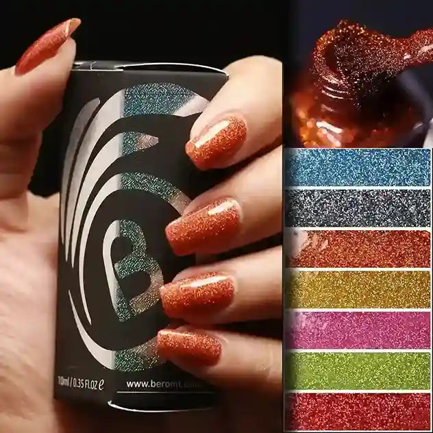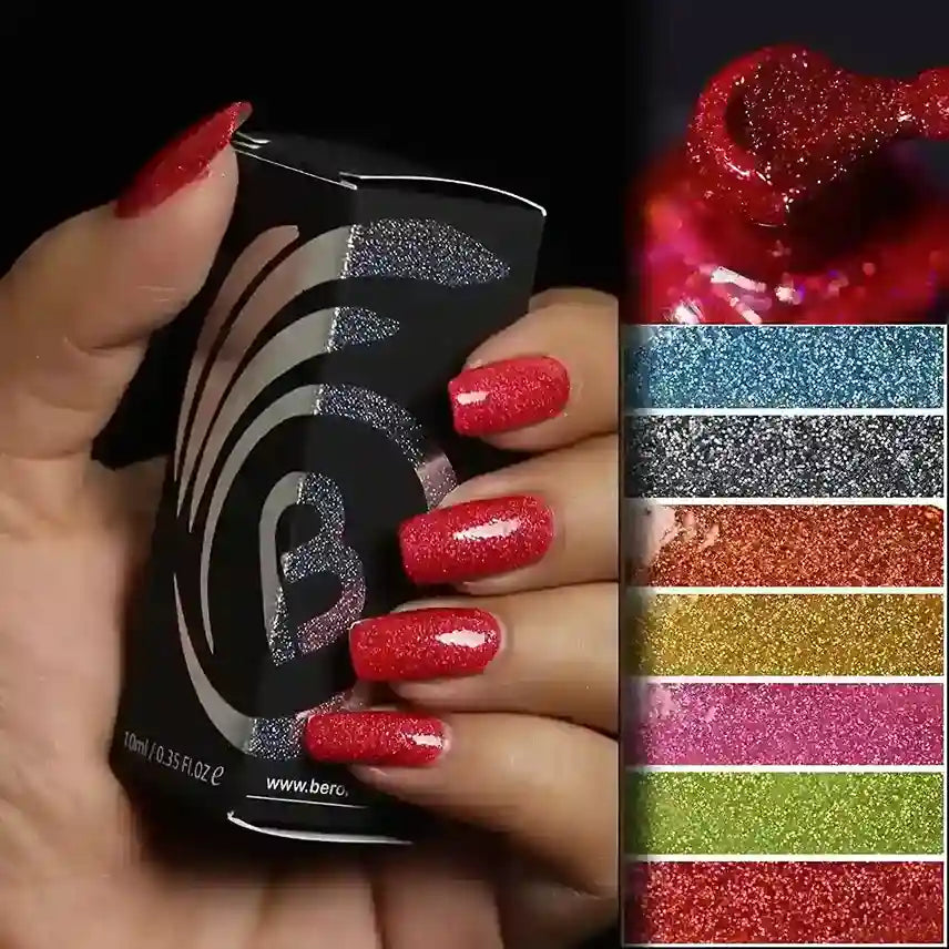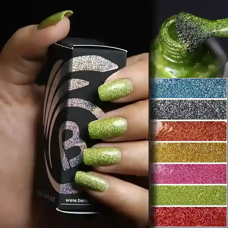 Looking for a novelty polish with a fun look for those special occasions? Then check out the unique BEROMT Holographic nail polish. These polishes as iridescent, and the array of colors that are produced with the play of light on them creates fascinating effects. This effect is due to microfine particle called SPECTRAFLAIR which gives nice play of light. One thing is for sure; your nails will be noticed and commented on! Turn on your mobile flashlight, focus it on your holo nails and watch the beautiful holographic effect come alive. Shine 0n!!