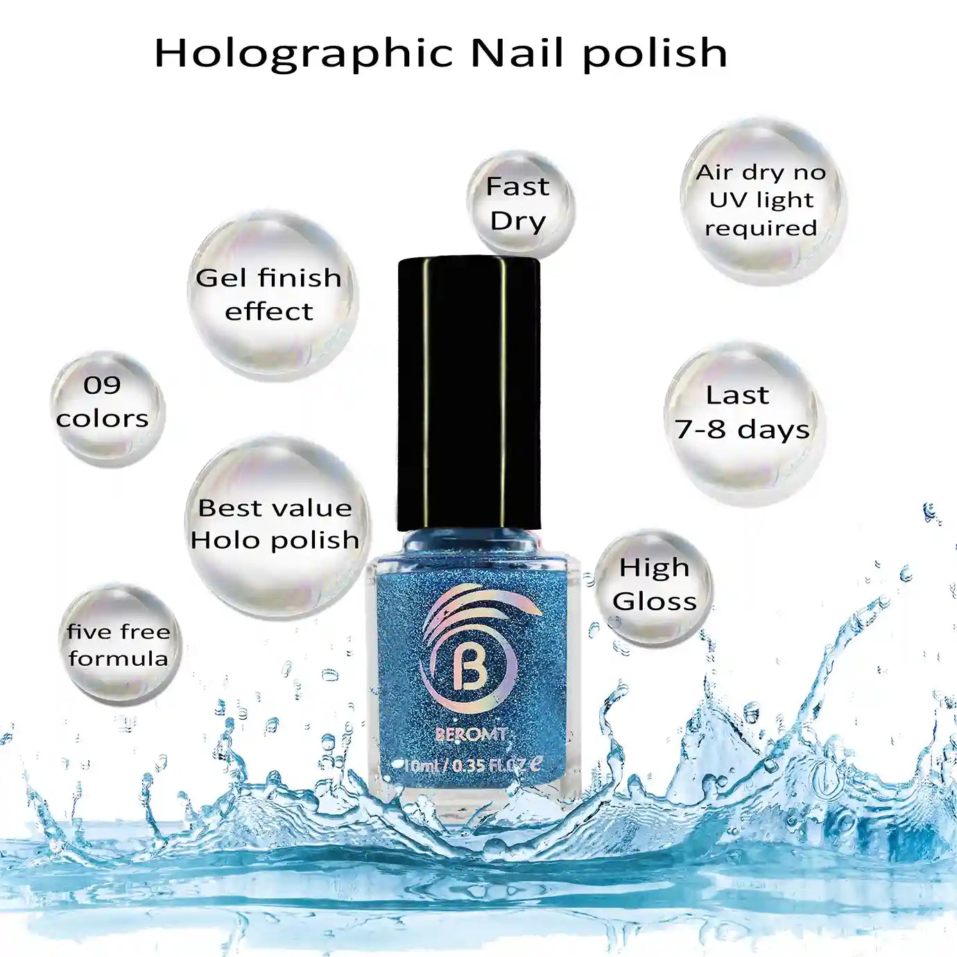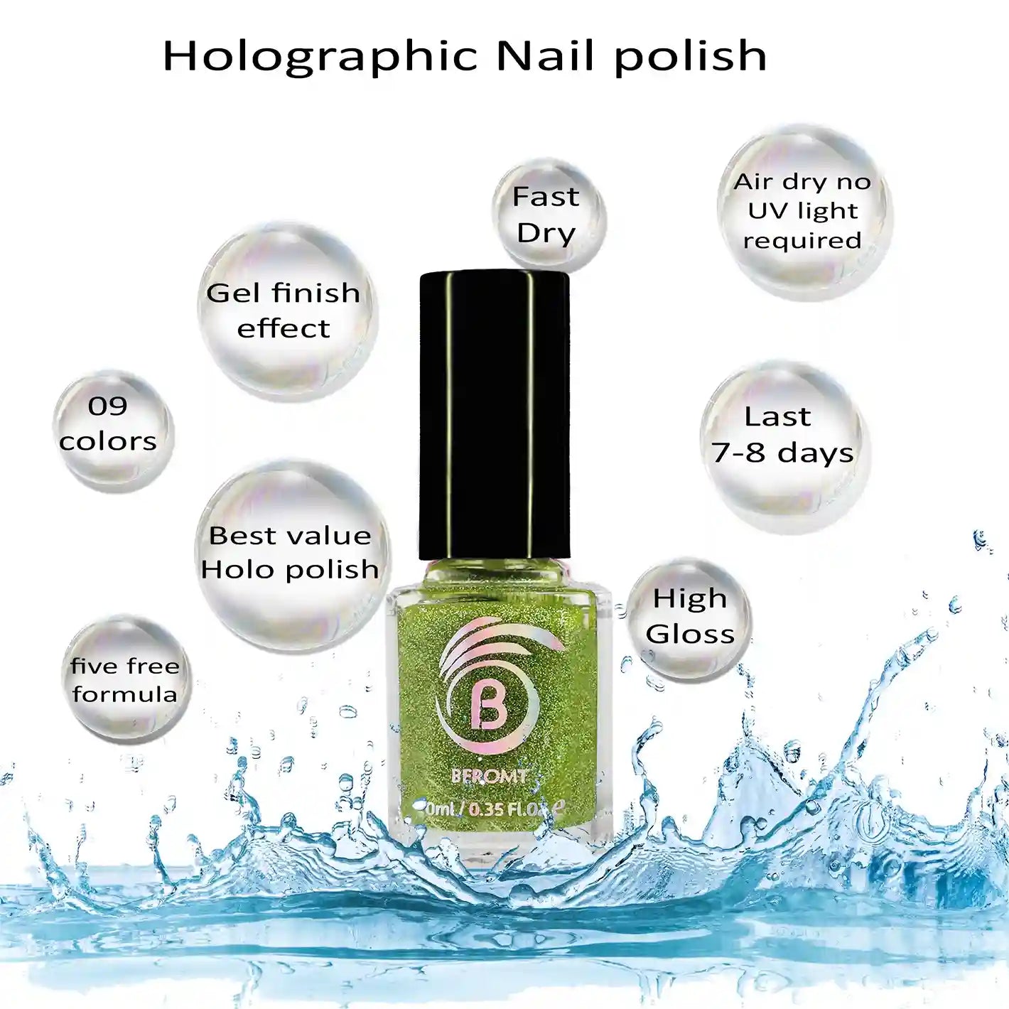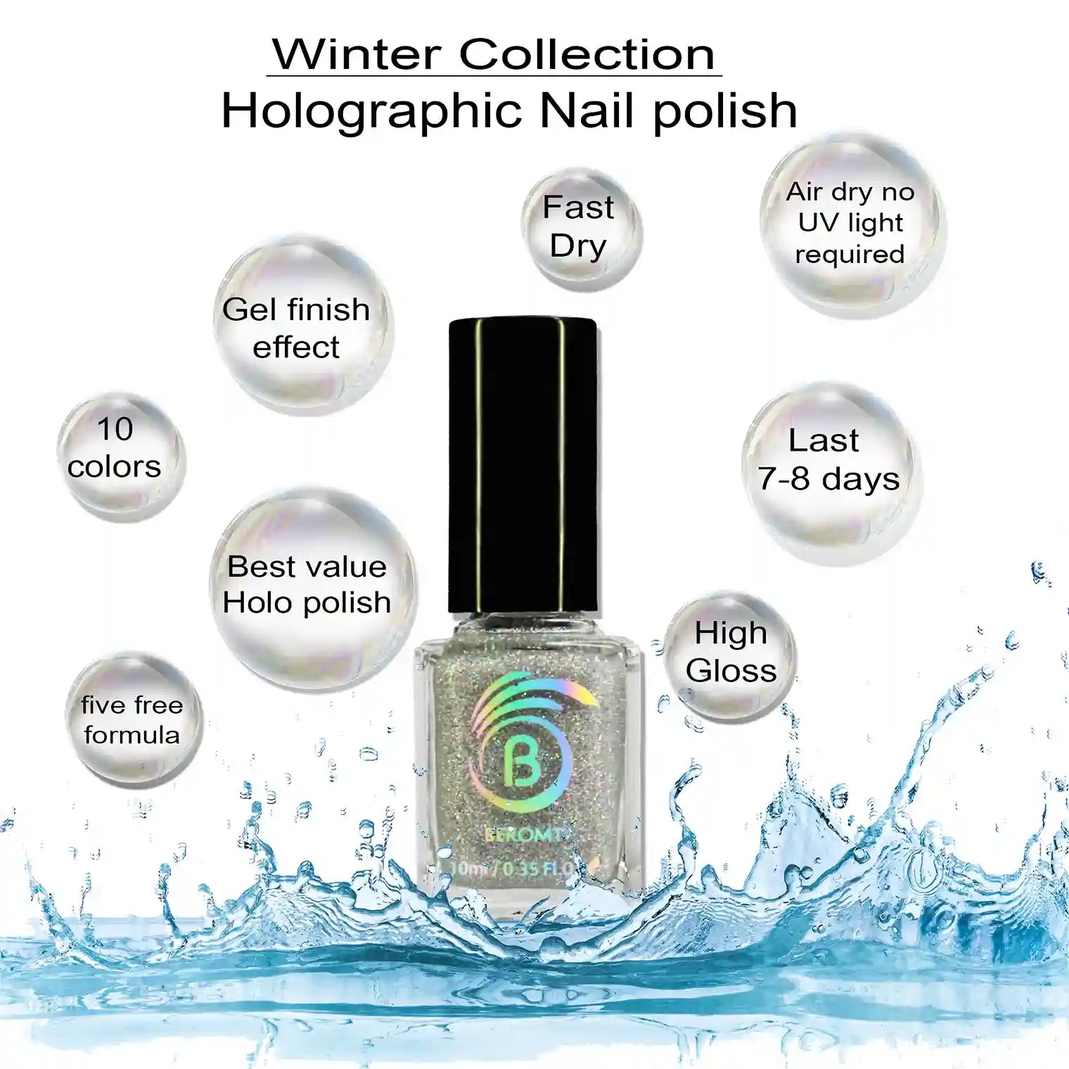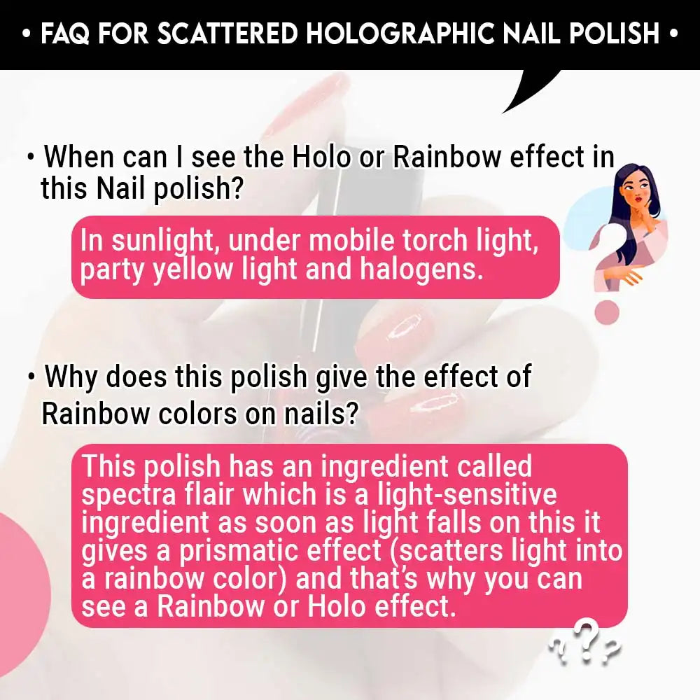 Note- Holo graphic polishes look best under direct light, such as sunlight or strong indoor bulbs, to bring out the prismatic rainbow effect.