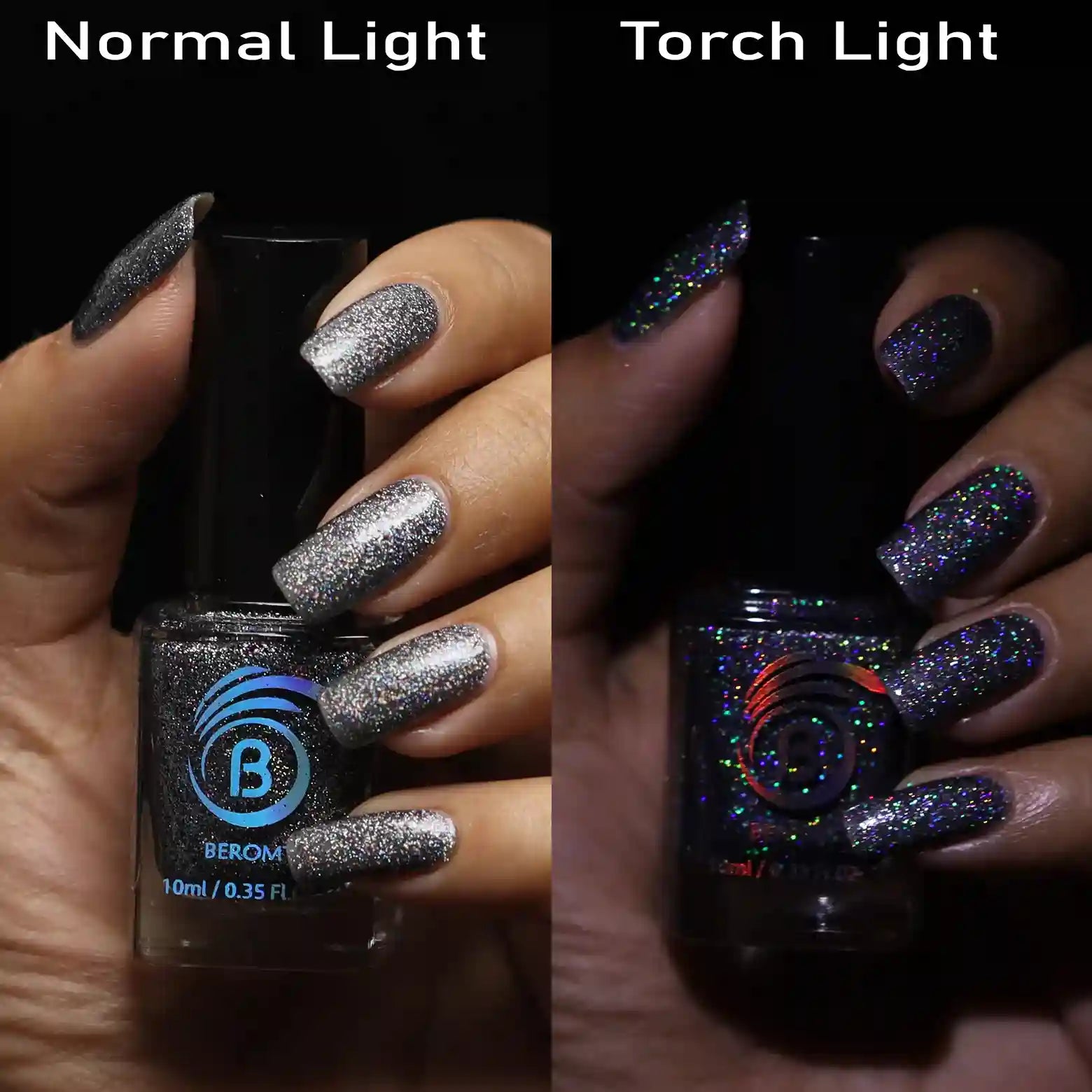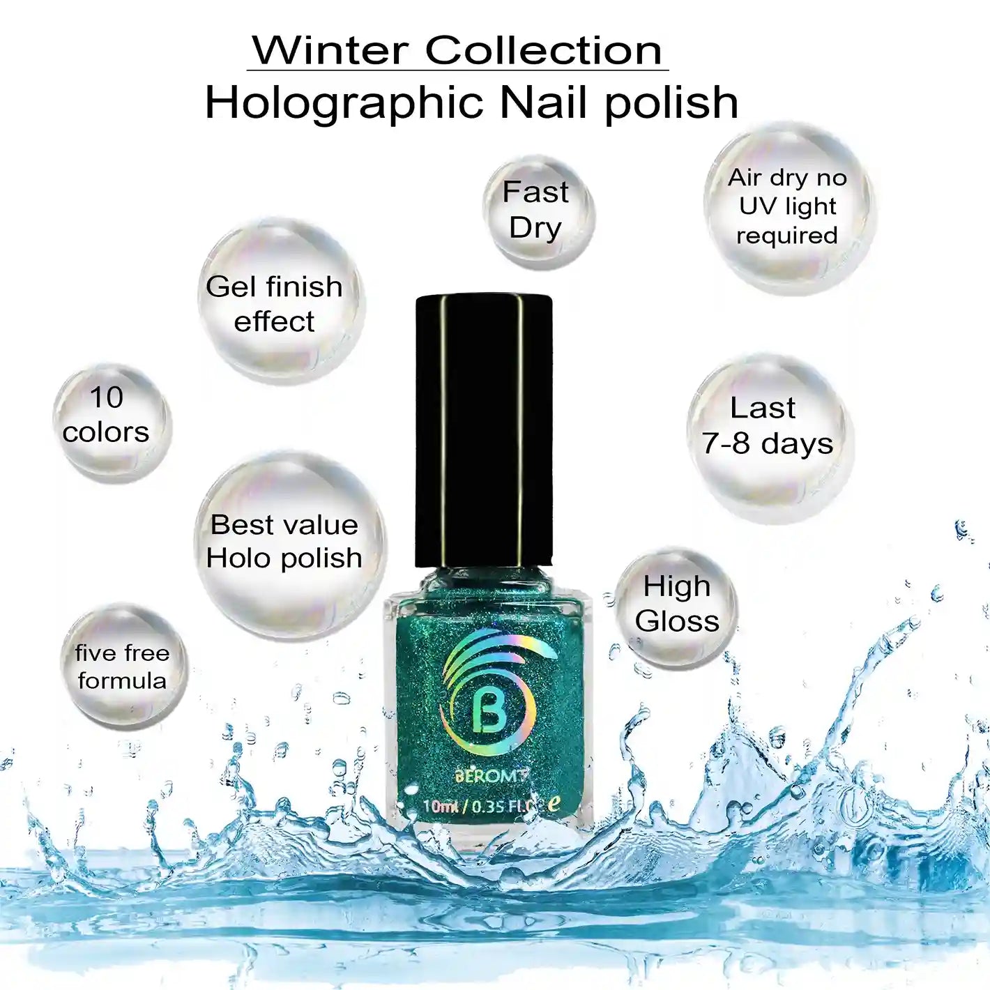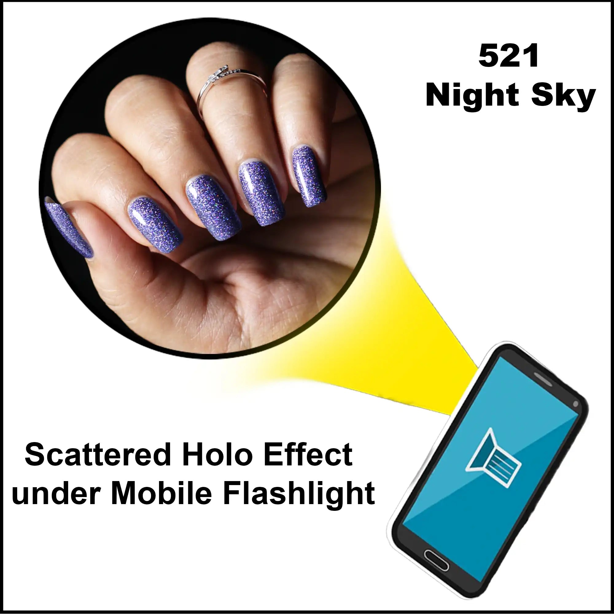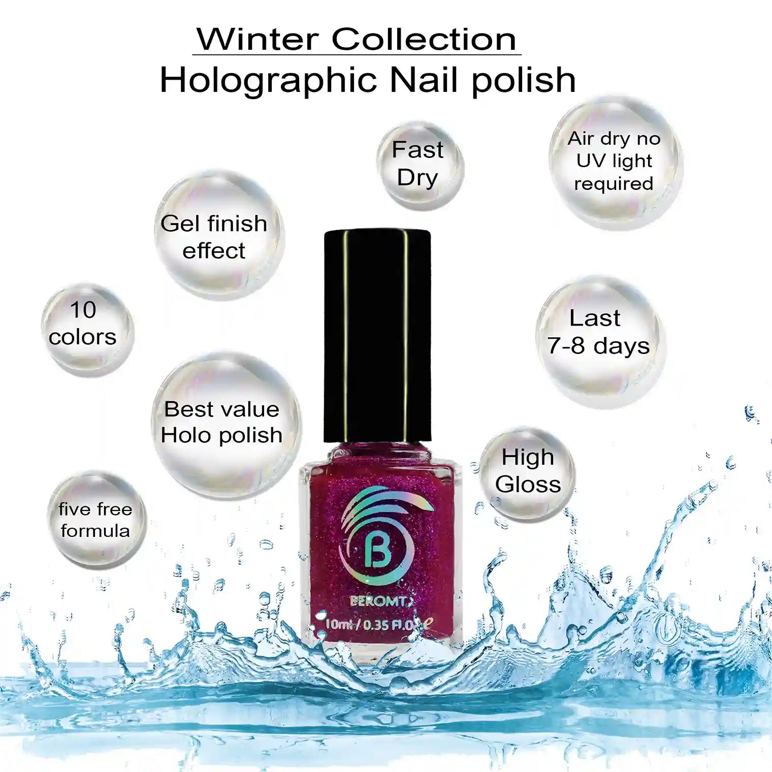 Note- Holo graphic polishes look best under direct light, such as sunlight or strong indoor bulbs, to bring out the prismatic rainbow effect.