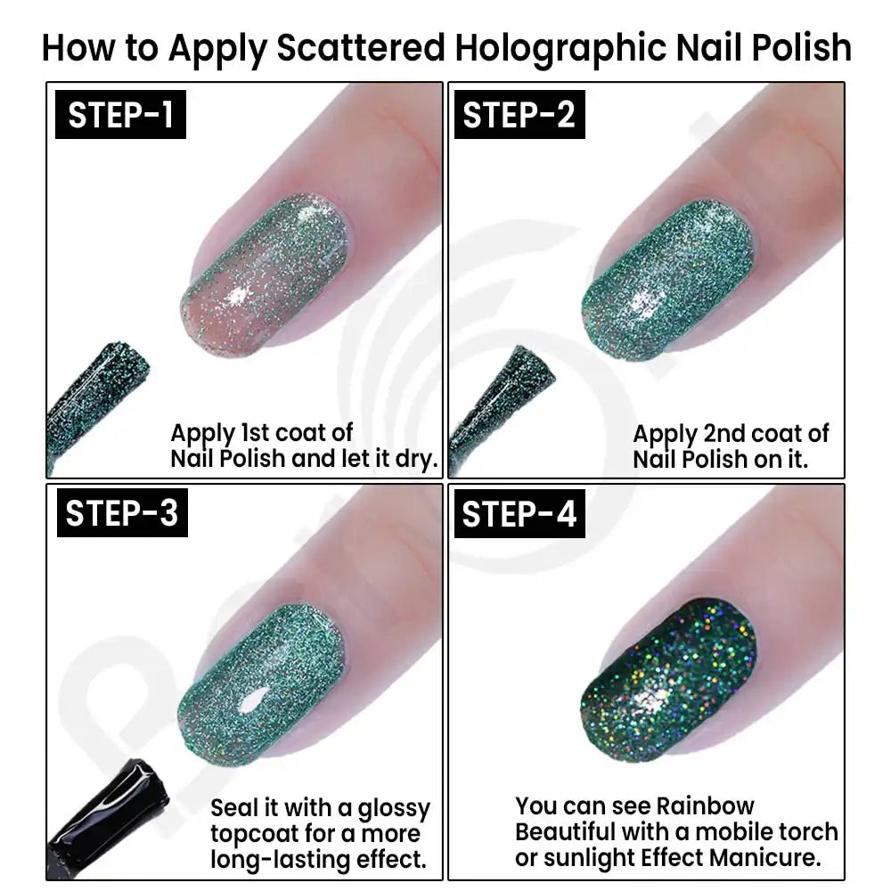 Apply the first coat of the Scattered Holographic Nail Polish. Ensure you cover the entire nail evenly. Let it dry completely before proceeding to the next step.