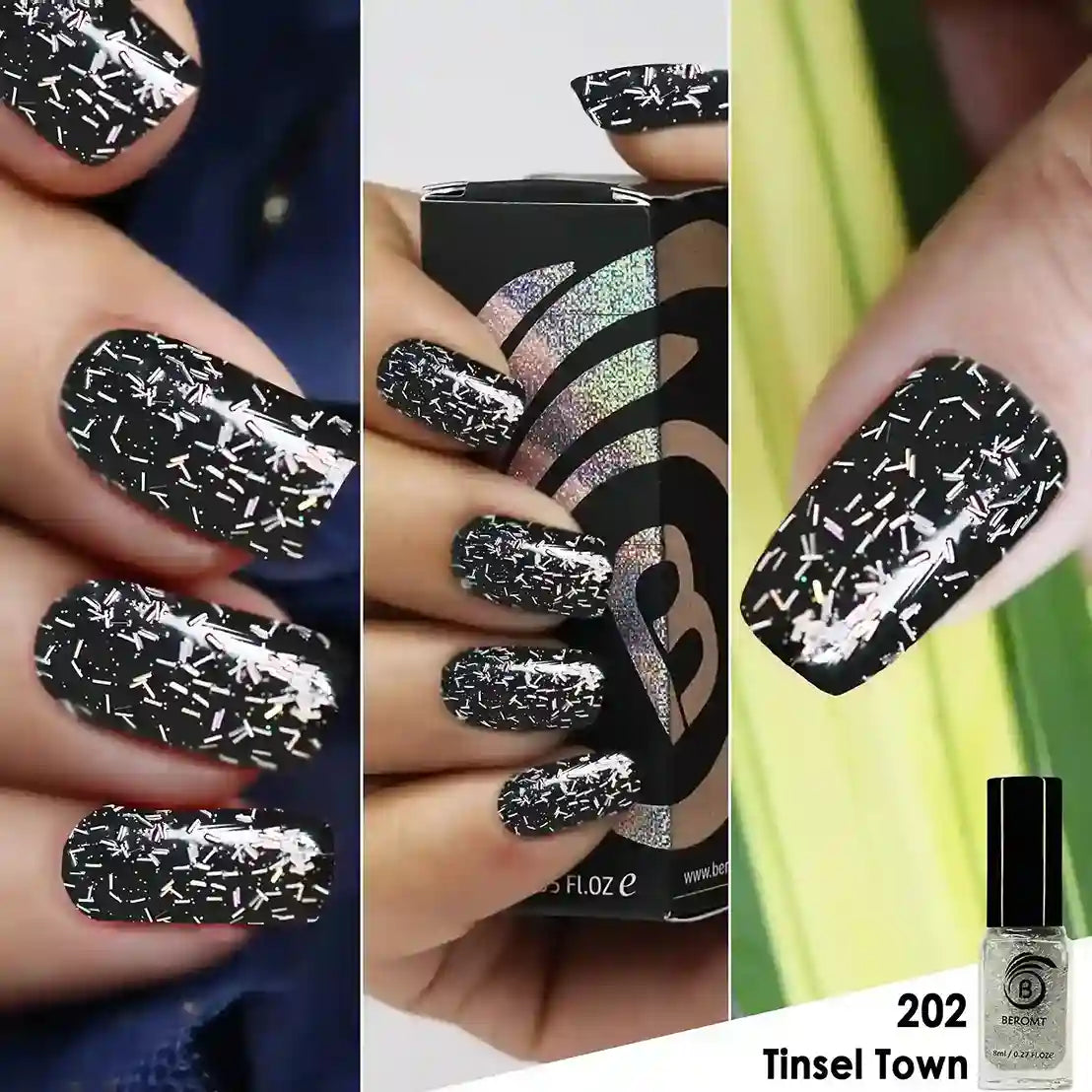 Tinsel Town is a striking metallic silver flakie topper! Sitting in a clear glossy base, Tinsel Town is glistening with reflective silver flakes varying in size. Garnish any base color of your choice with Tinsel Town for versatile twinkle to any manicure!