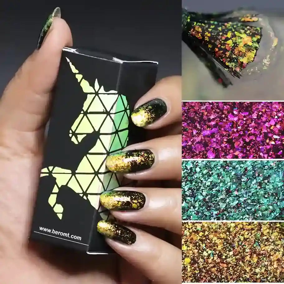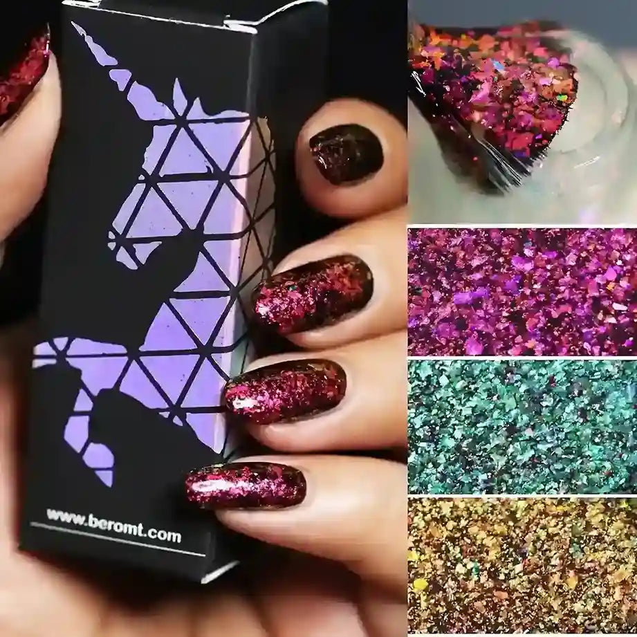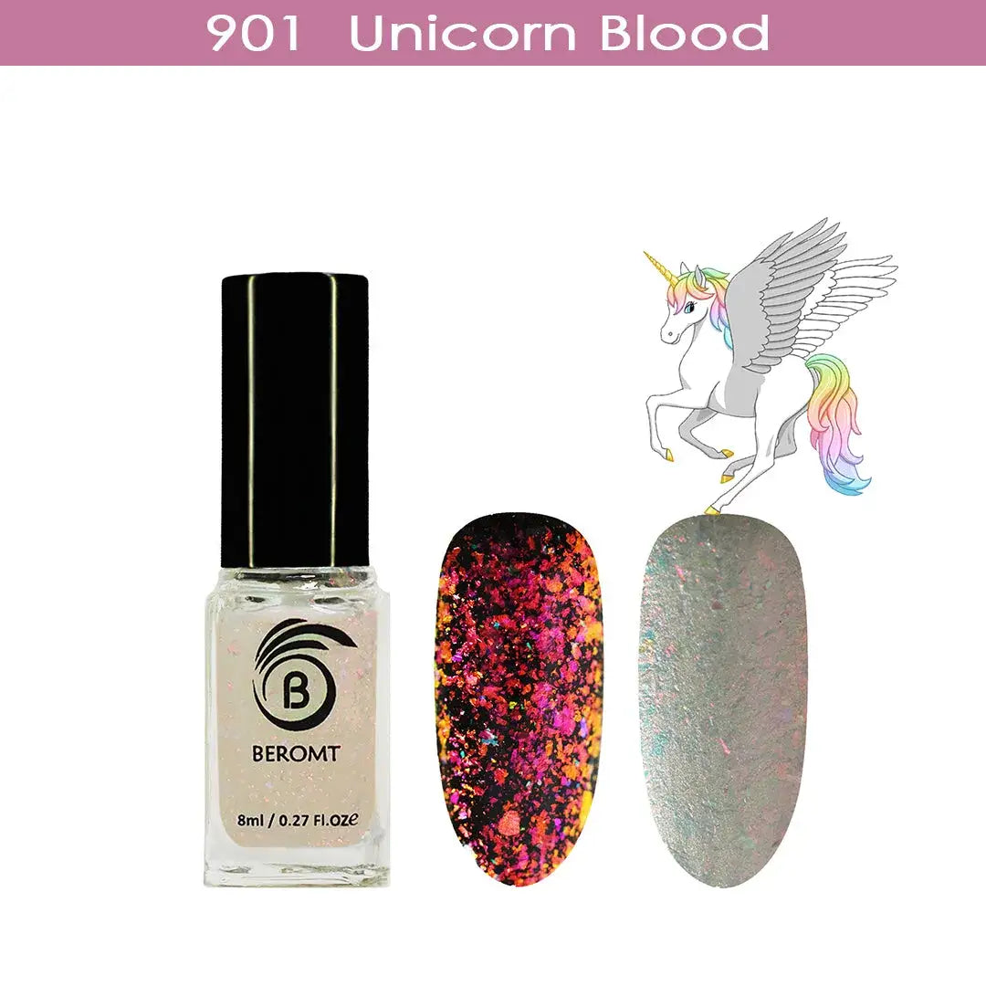 Unicorn Blood is part of Beromt’s New Unicorn Nail Polish Collection, class of incredibly vivid unicorn nail polish toppers. Our Unicorn Nail Polish toppers are stunningly vibrant and practically glow in any light. These are precisely formulated for maximum effect payoff and extreme versatility.